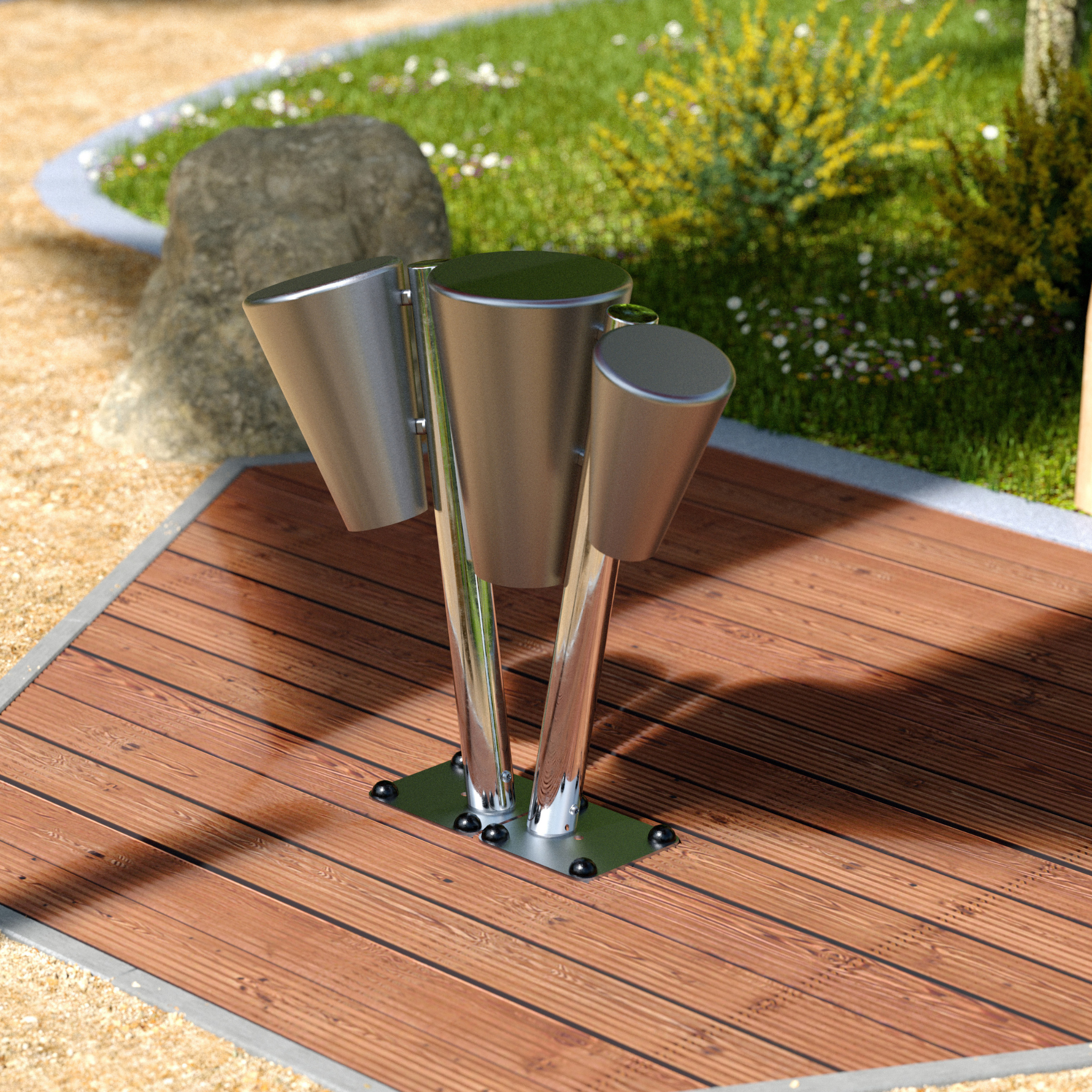 Street Congas Trio er et utendørs trommeinstrument i rustfritt stål med tre trommehoder på en enkelt, polert stolpe. Formatet inviterer til lagdelte rytmer, turtaking og samarbeid på tvers av aldre og evner. De børstede ståloverflatene gir en moderne estetikk og en fokusert, klar tone når man spiller hender, mens konstruksjonen er værbestandig, hærverkssikker og krever minimal betjening. Høyde ca. 1000 mm, trommelskinn Ø ca. 200 mm, vekt ca. 25 kg. Velg overflate- eller bakkemontering avhengig av underlaget. Ideelt som et skulpturelt samlingspunkt i parker, torg, gater og fellesområder – eller der du ønsker en ubevoktet urban rytme. Trioen fungerer som et sosialt anker: én setter den grunnleggende pulsen, to andre svarer med mønstre og fyll. Den faste tonen gir en jevn lyd over hele settet. Bruk korte øvelser (4–8 slag) med ekko og call-response for å tenne felles groove på sekunder. Overflater rengjøres med mildt vaskemiddel; Mekanikker krever bare rutinemessige sjekker.