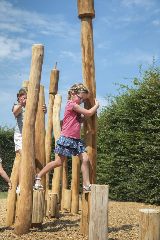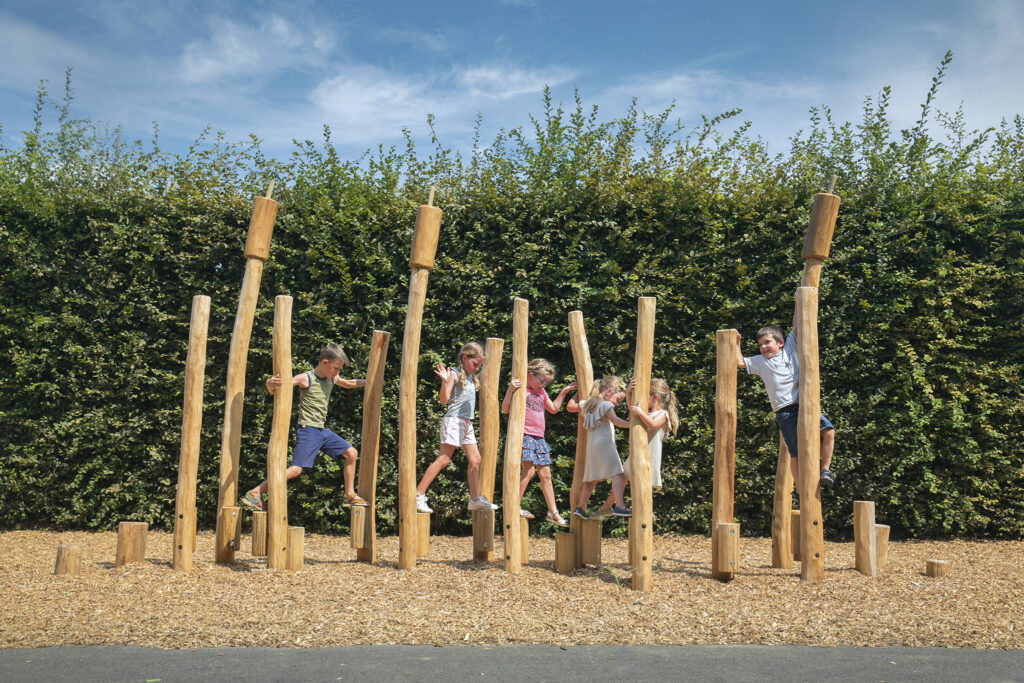 Styltesti i Robinia med 17 stolper /balansestubber for barn i alderen 3 til 12 år. Hvem kan nå den andre siden uten å berøre bakken? Konstruksjonen er festet ned i bakken med betong.