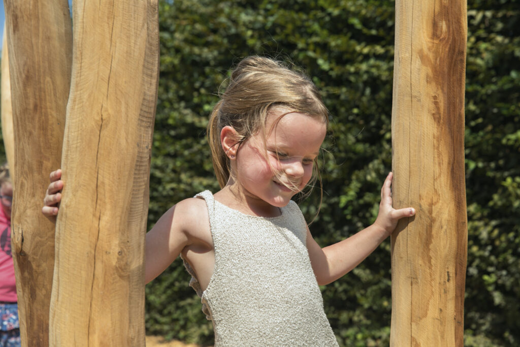 Styltesti i Robinia med 6 stolper. Hvem kan nå den andre siden uten å berøre bakken? Konstruksjonen er festet ned i bakken med betong.