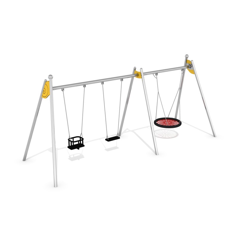 Trippel huske med stilistikk som refererer til sneglens former og sterke farger. Husken består av ett flatt sete, ett babybokssete og ett fuglereirsete som henger i kjedene. Konstruksjonen er laget av rustfritt stål, motstandsdyktig mot værforhold og intensiv bruk. Innleggene avsluttes med å dekorere en rund kule som dannes til sneglehornet. Alle rustfrie Limako-produkter er tilgjengelige i galvanisert og pulverlakkert versjon. (Ta kontakt for andre huskeseter)