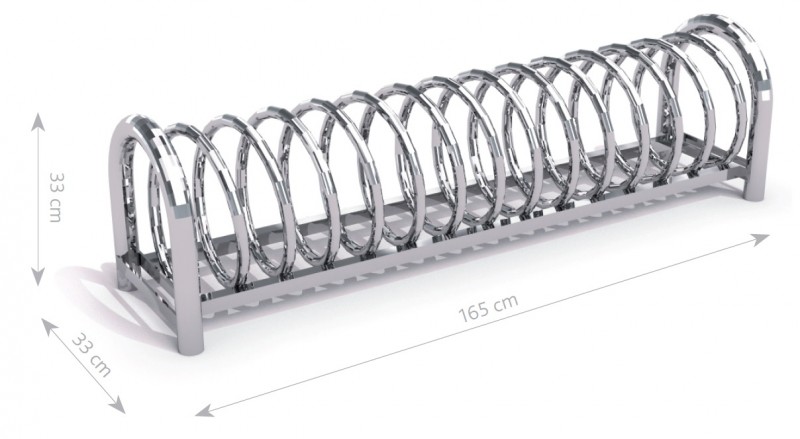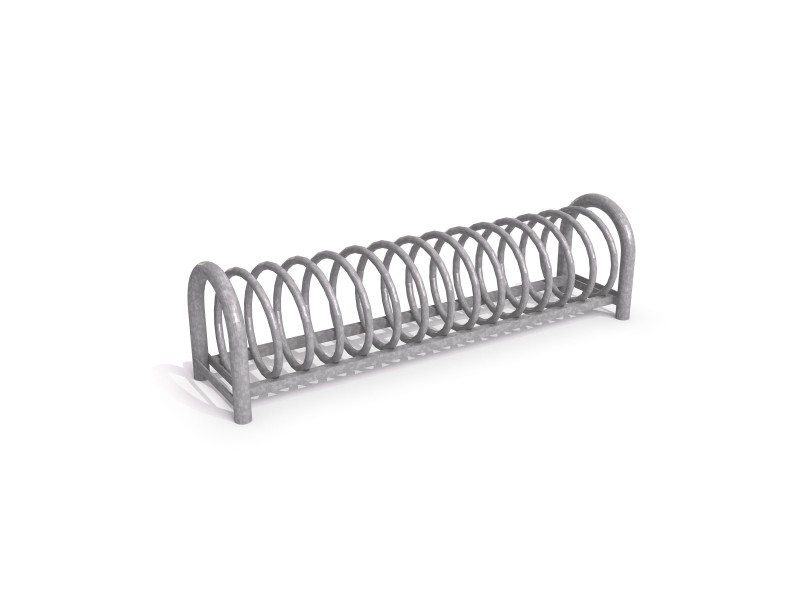 Spiralformet stålsykkelstativ for 6 sykler. 2 U-formede monteringsben.
