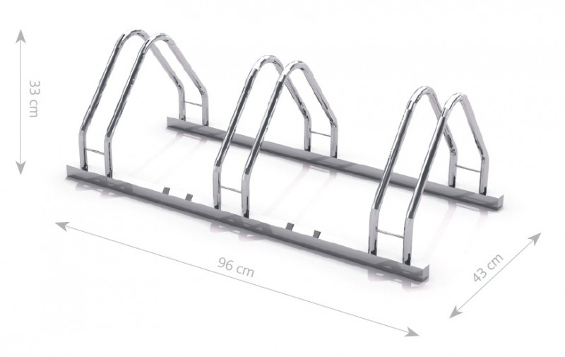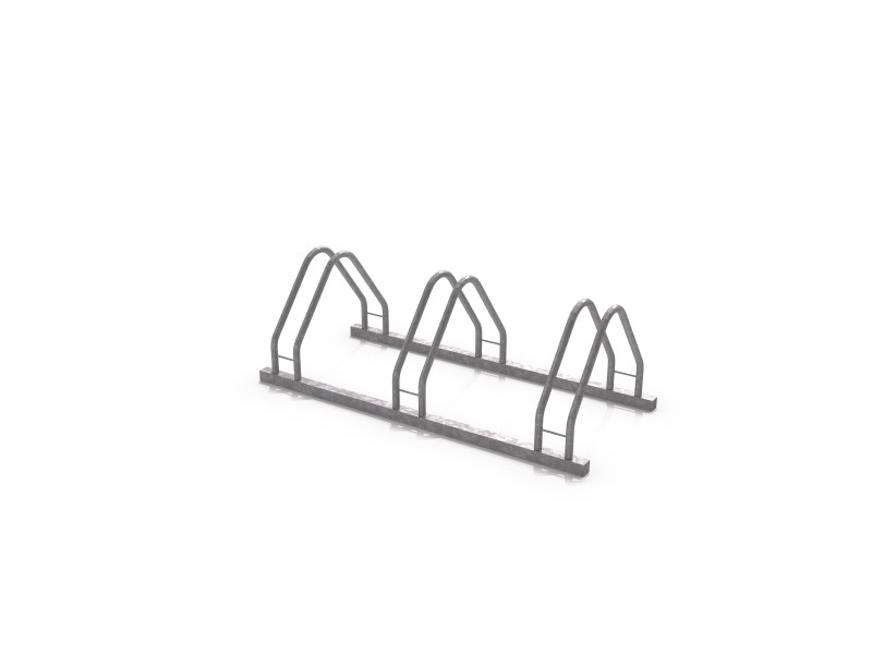Stålsykkelstativ for 3 sykler. 3 omvendte L-formede fester for hjul, koblet sammen med en bunnprofil i stål. Ikke tilgjengelig for skivebremser.