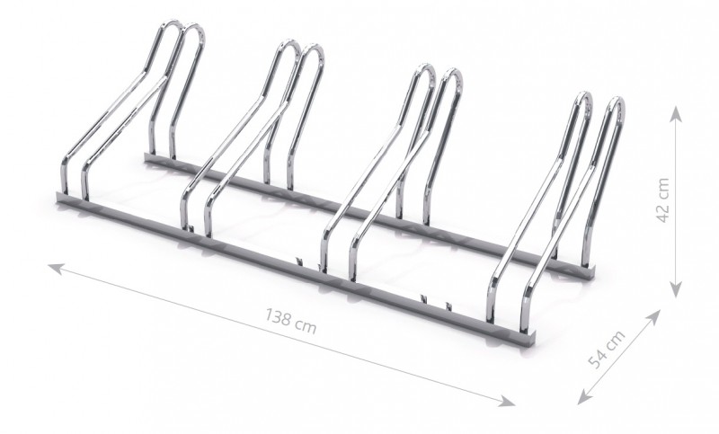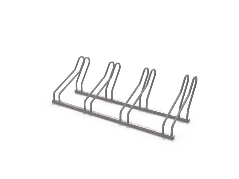 Stålsykkelstativ for 4 sykler. 4 fester for hjul koblet sammen med en nederste stålprofil.