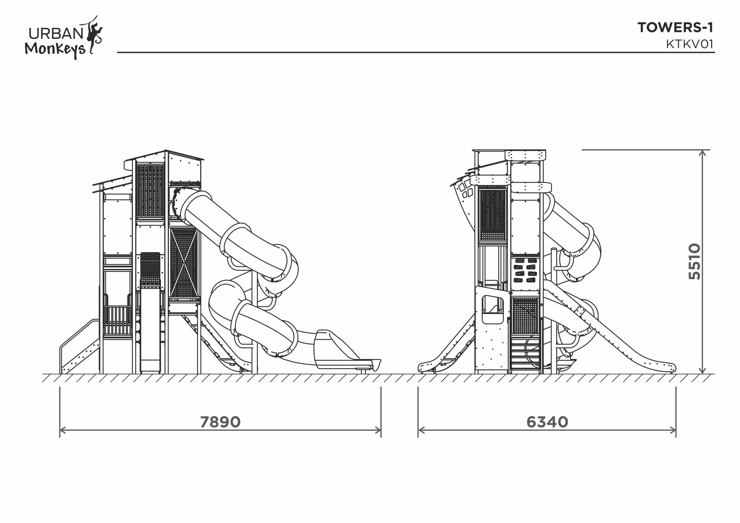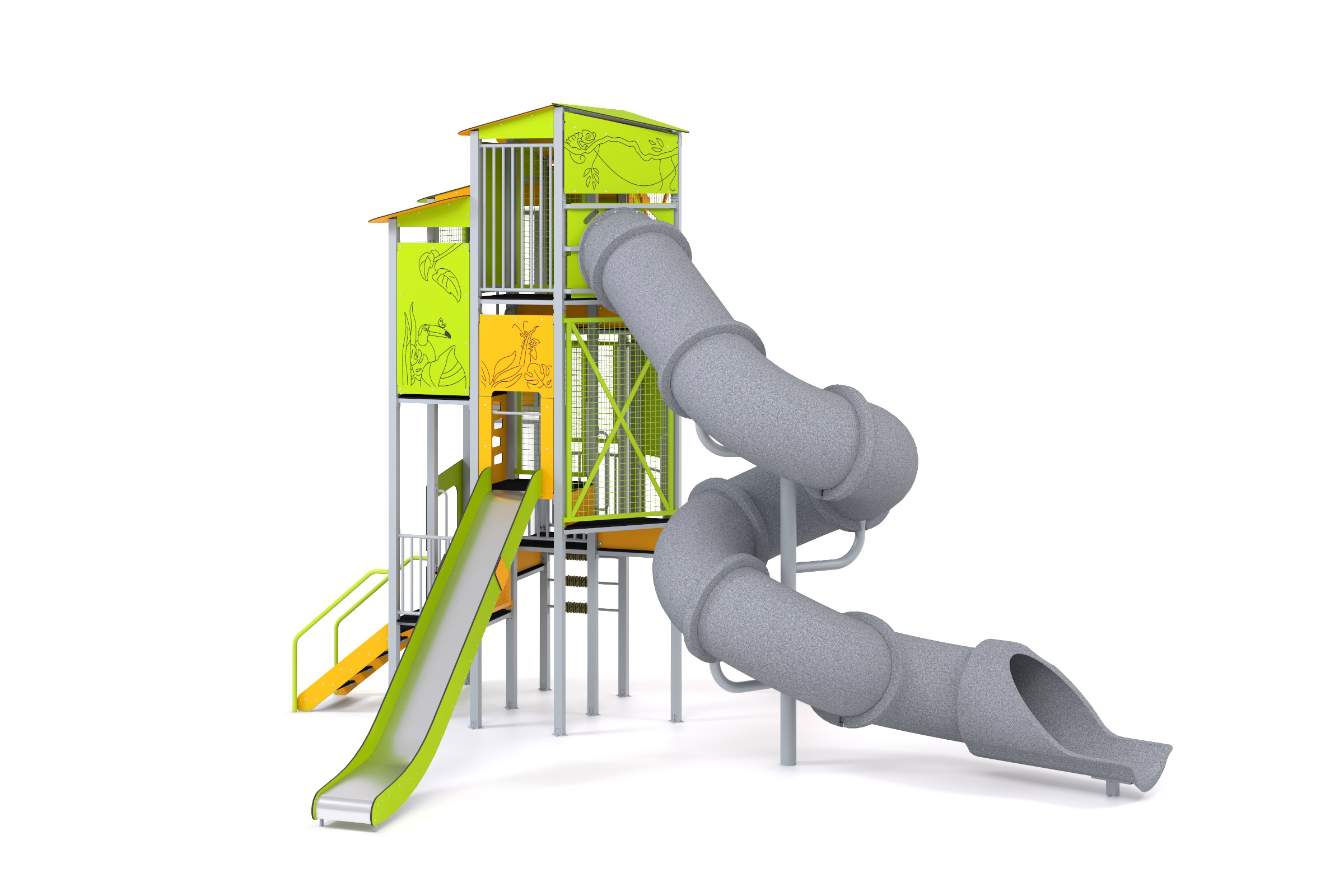 Tårnkomplekset inkluderer en tunnel, sklier, lekemoduler, klatrepaneler og koøye, som gir interessant fritid for barn i ulike aldersgrupper. Velg mellom 12 standard farger på stål og 8 standard farger på HDPE. Andre farger på forespørsel.