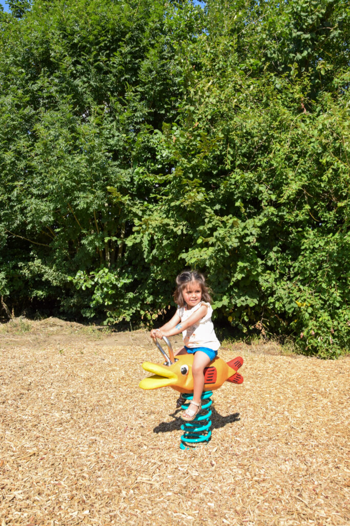 Vippe for barn i alderen 2 til 6 år. Vippen består av en fjær belagt med polyester som er montert på en galvanisert jordfesting. På toppen er et figurativt sitteelement formet som en gullfisk montert. Gullfisken er laget av Robinia og har oransje detaljer. Fjæren er laget av 20 mm tykt fjærstål. Alle metalldeler er behandlet mot rust, og alle muttere og bolter er helt dekket med blomsterformede beskyttelseshetter. Fjæren er designet slik at du aldri kan bli klemt, ikke engang ved den tyngste belastningen. Fjærens elastisitet beregnes slik at bevegelsen kommer til høyre selv for de små.